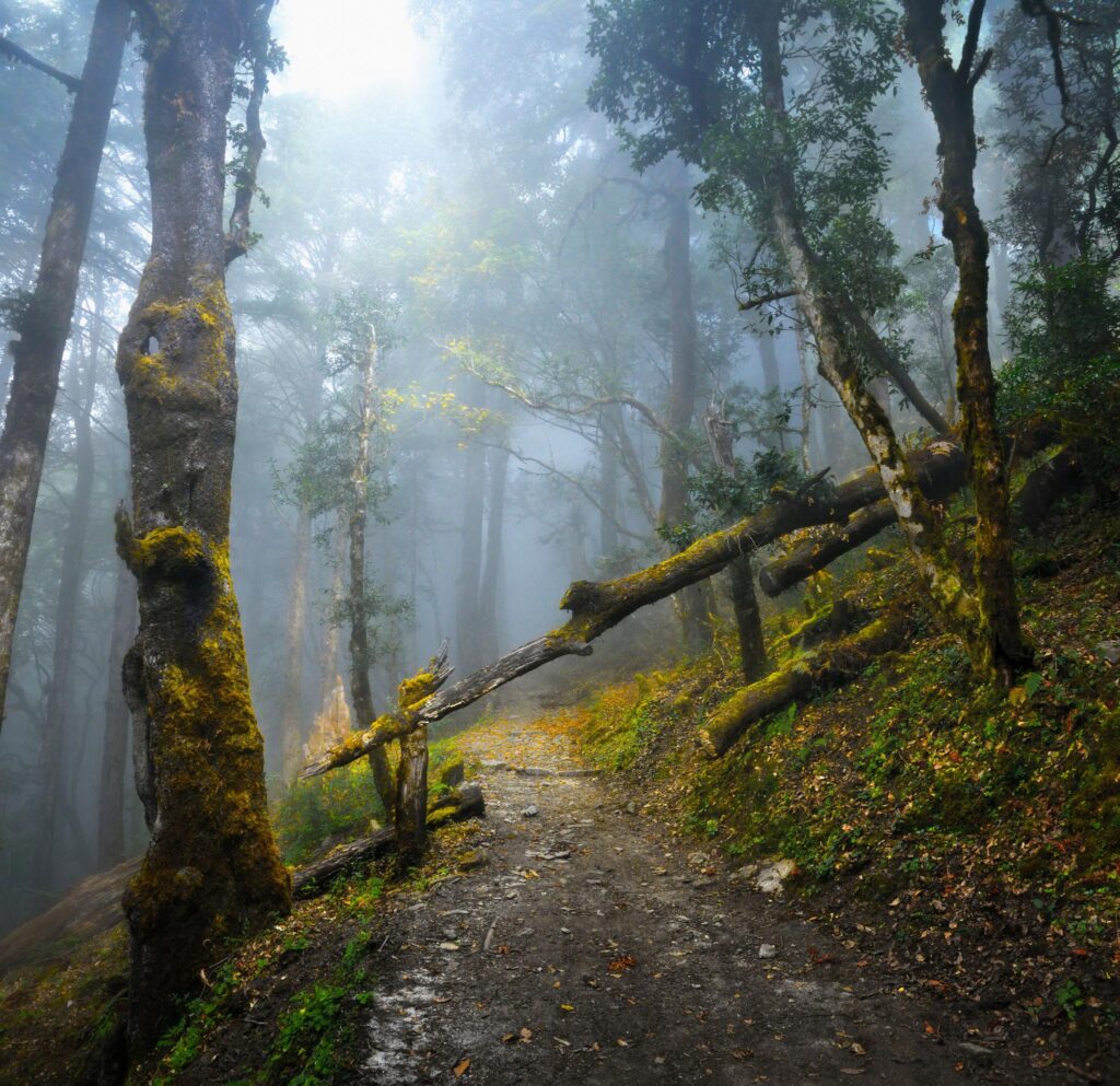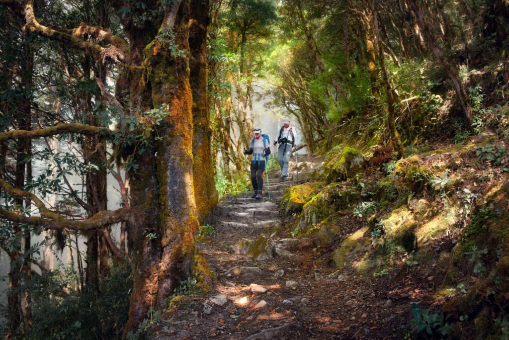 Most treks in Nepal begin in warm, green areas filled with forests and rivers. Trails are surrounded by rhododendron trees, especially in spring, creating colorful landscapes.